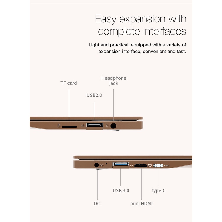 2* USB3.0 port, Mini HDMI×1, 1 * 3.5mm Headphone Jack port, 1 * Charging port, 1 * TF card slot, Type-c port *1